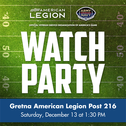 The Gretna American Legion is hosting a Watch Party for the annual Army-Navy Football Game. The game is on Saturday, December 13th. Doors open at 1:30 PM and kick-off is at 2:00 PM. The Legion Bar will be open. Feel free to bring a snack to share if you'd like. There's no cover charge or admission fee. This event is open to the public