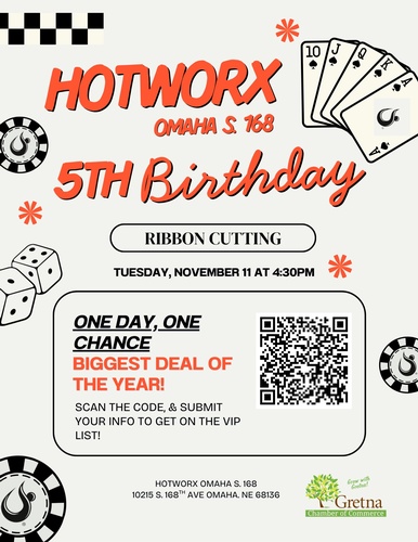 Help us celebrate a milestone that's five years in the making! Join the Gretna Chamber as we cut the ribbon and say Happy 5th Birthday to HOTWORX! Stop by and celebrate a business that been bringing the heat to our community since day one!