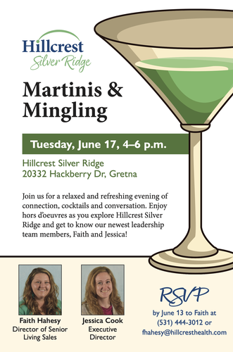 Join us for a relaxed and refreshing evening of connection, cocktails and conversation. Enjoy hors d’oeuvres as you explore Hillcrest Silver Ridge and get to know our newest leadership team members, Faith and Jessica! RSVP by June 13 to Faith: (531) 444-3012 or fhahesy@hillcresthealth.com