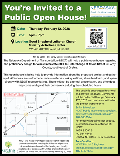 The Nebraska Department of Transportation is hosting a Public Open House to share the preliminary design for a new I-80 interchange at 192nd Street.