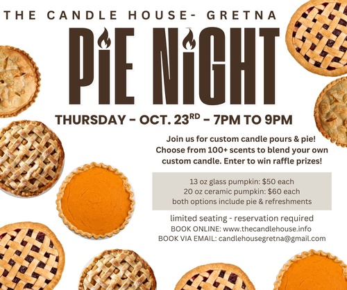 Join us for custom candle pours & pie! Choose from 100+ scents to blend your own custom candle. Enter to win raffle prizes! After booking online @ www.thecandlehouse.info - we will reach out with an email to confirm your reservation and to ask what pumpkin vessel you would like to pour. A $10 deposit will also be required per person. Details on collecting the deposit will also be in the confirmation email.
