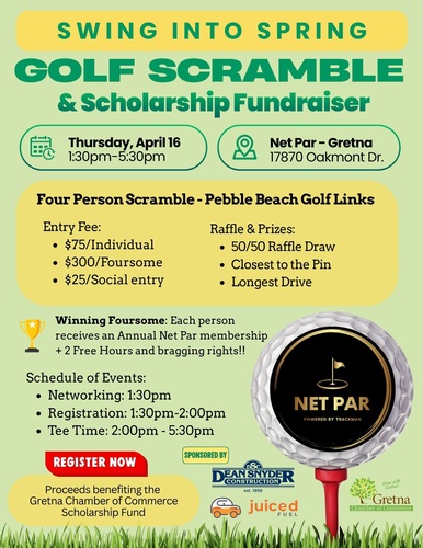 Join us for a four-person scramble at NetPar for our Spring Swing Fundraiser benefiting the Gretna Chamber Scholarship Fun! Register as an individual or grab your foursome and hit the greens for a great cause.